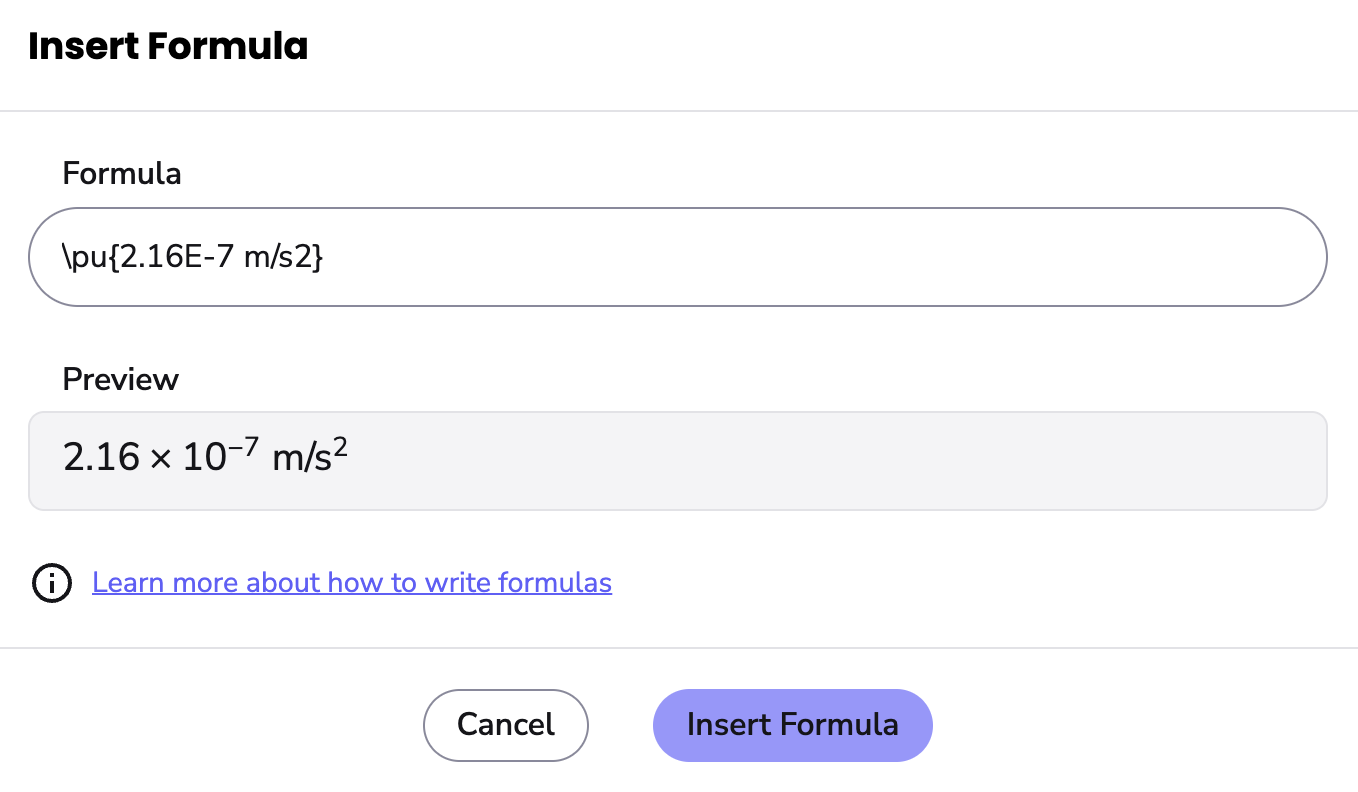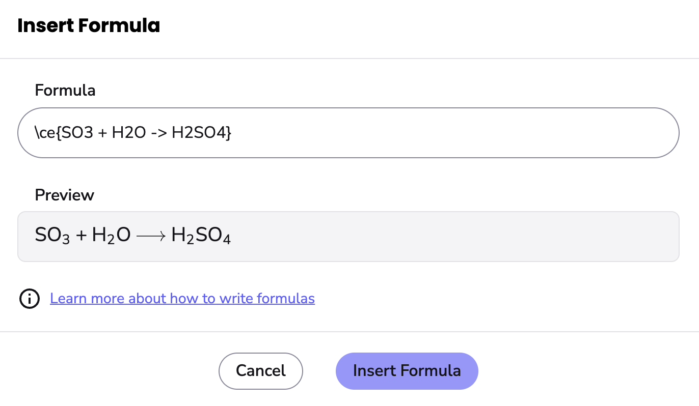 Info - We use KaTeX for entering formula this is very similar to LaTeX that you maybe familiar with.
